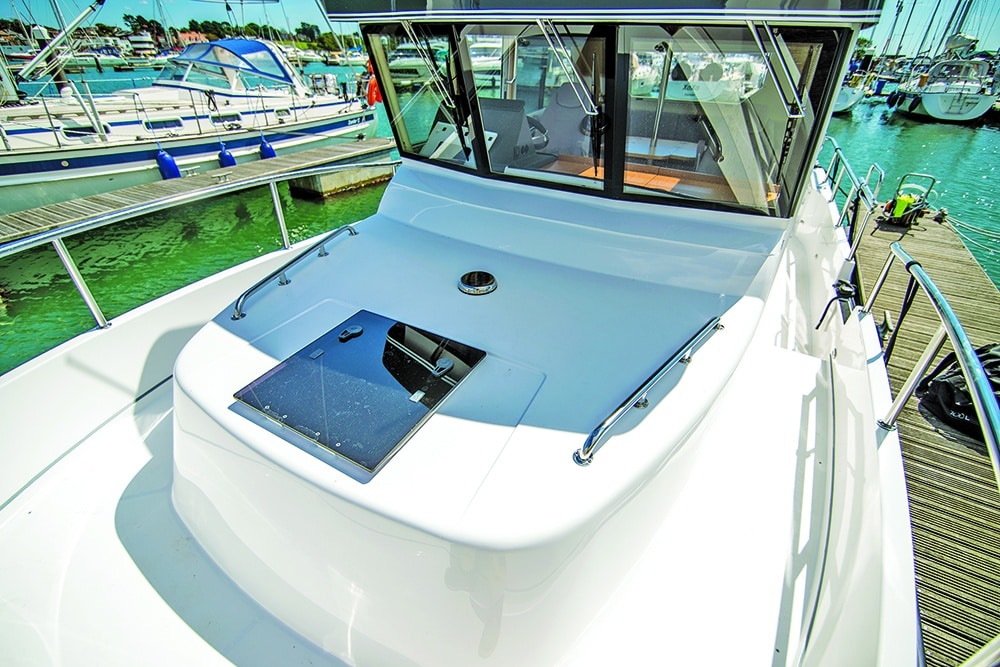 On deck, with its wide side decks, this boat is reassuringly safe to move around when underway. The bulwarks are tall and the handrails are at just the right height. Now there is a bulwark gate on either side, opposite each wheelhouse door – ideal for going single-crewed. Most people will feel inclined to board the boat via its newly extended bathing platform, which provides cockpit access through a chunky transom gate. Four fender cages sit on the rear guard rail, and inside the transom there are three bench seats, with storage lockers underneath – one of which houses the electrical master switches. Engine access is quick and easy, with the large cockpit hatch providing plenty of space around the engine. The standard of finish and engineering is of the highest quality. Not a single service item is a stretch or a squeeze to access, notably the raw-water strainer sitting at the front of the engine block. True to form, the deck hardware is hard-core, especially the stainless windlass, and the cavernous anchor locker houses more anchor chain than you are ever likely to need.